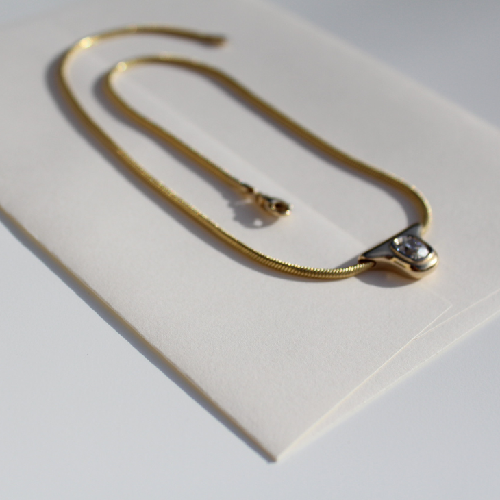 Designed to feel pillowy, with an old mine diamond resting in white gold, the Astrid features our signature two-toned finish, paired with a 2mm round snake chain, and lobster clasp.