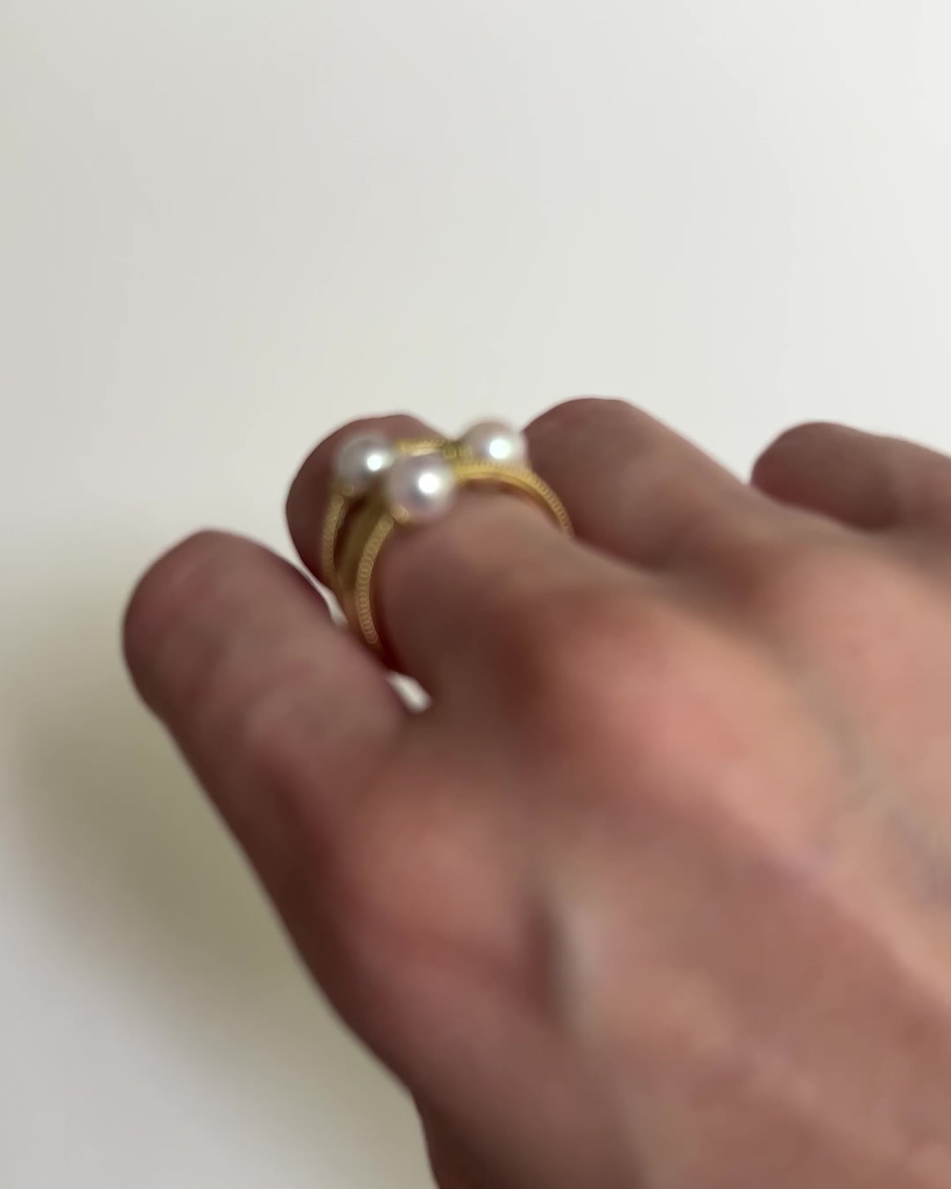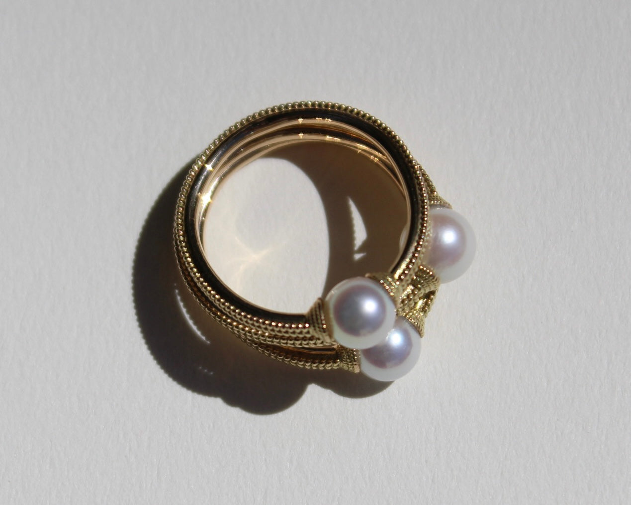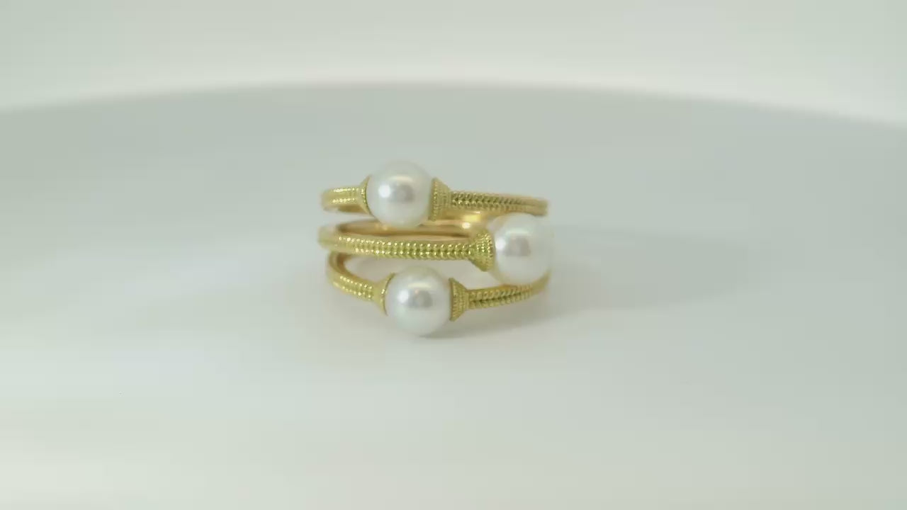 Features three Japanese Saltwater Akoya Pearls, with a staggered and textured band.