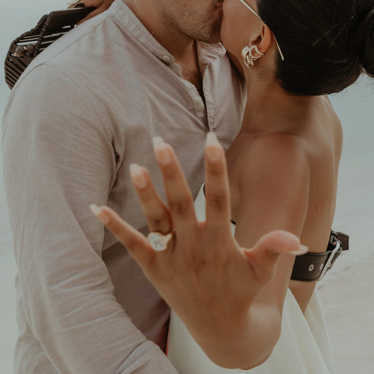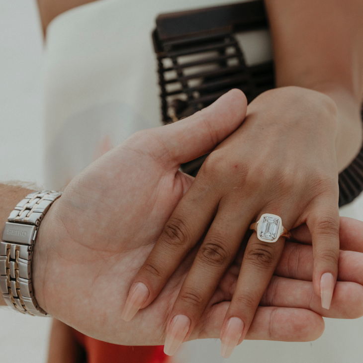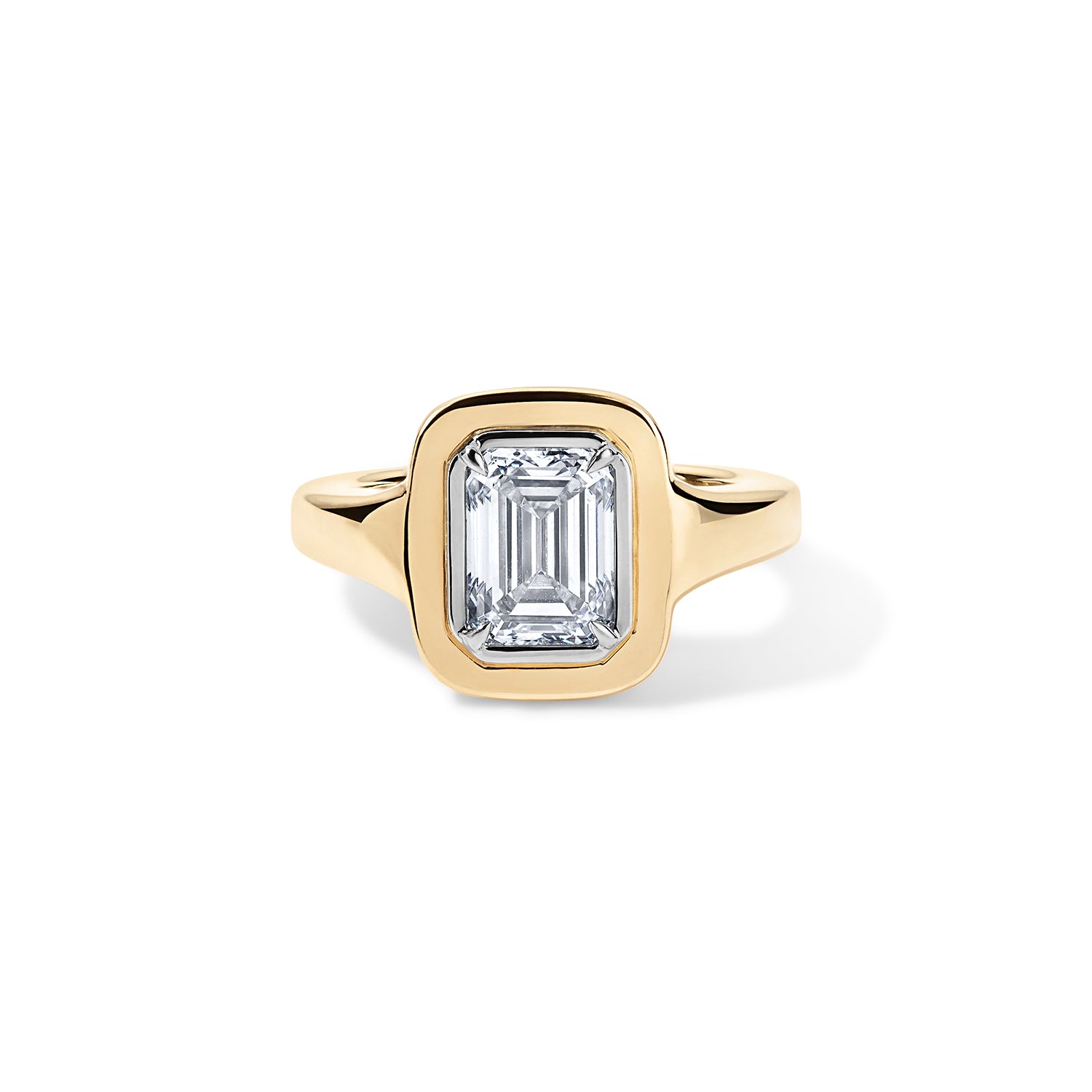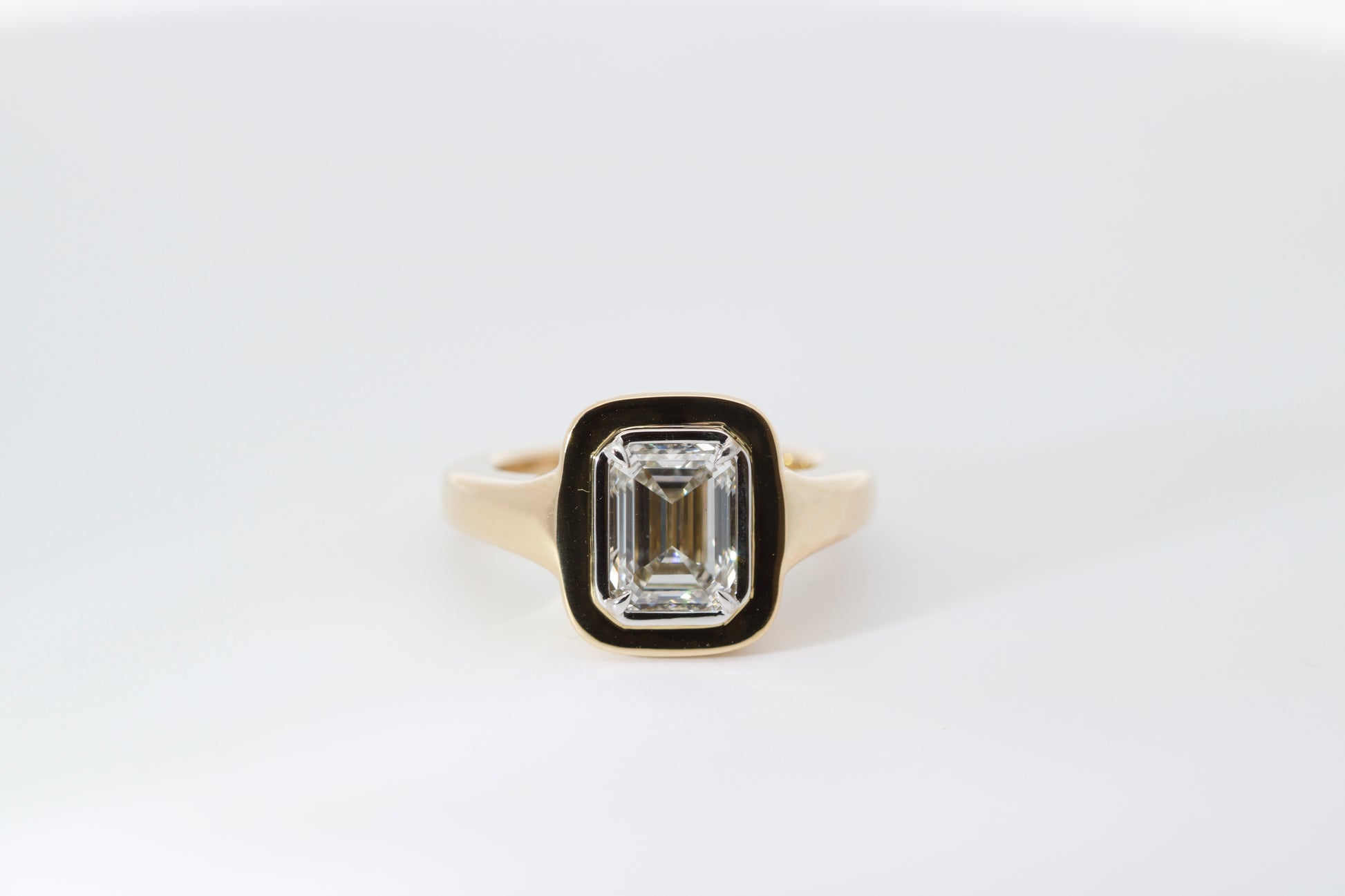 The Rachel is crafted to exude an organic yet classic elegance, with an emerald-cut diamond nestled in a pillowy bed of white gold. Showcasing our signature two-toned finish, this timeless piece is designed to make a statement. Created for the modern, bold bride or anyone wishing to celebrate themselves.